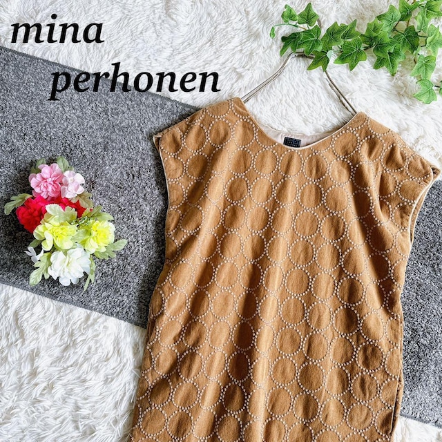 ミナペルホネン ワンピース ノースリーブ タンバリン 総柄 ベージュ 38 M